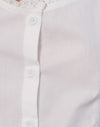Gronita Bluse mit weinrotem Gingham-Minidruck auf einem Popeline-Stoff. Mit Rundhalsausschnitt, Knopfleiste und Lochstickerei entlang des Halsausschnitts. Kombiniert mit einem Corazon Minirock.